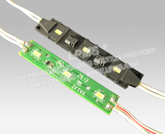 低壓注塑工藝運用于各式LED串燈、LED模組等的防水包封中, 對比傳統灌膠工藝與高壓注塑工藝,具有固化周期短、生產效率高、無損電子元器件、不良率低,注塑好的產品防水等級高等特點,正被越來越多的LED廠商采用。