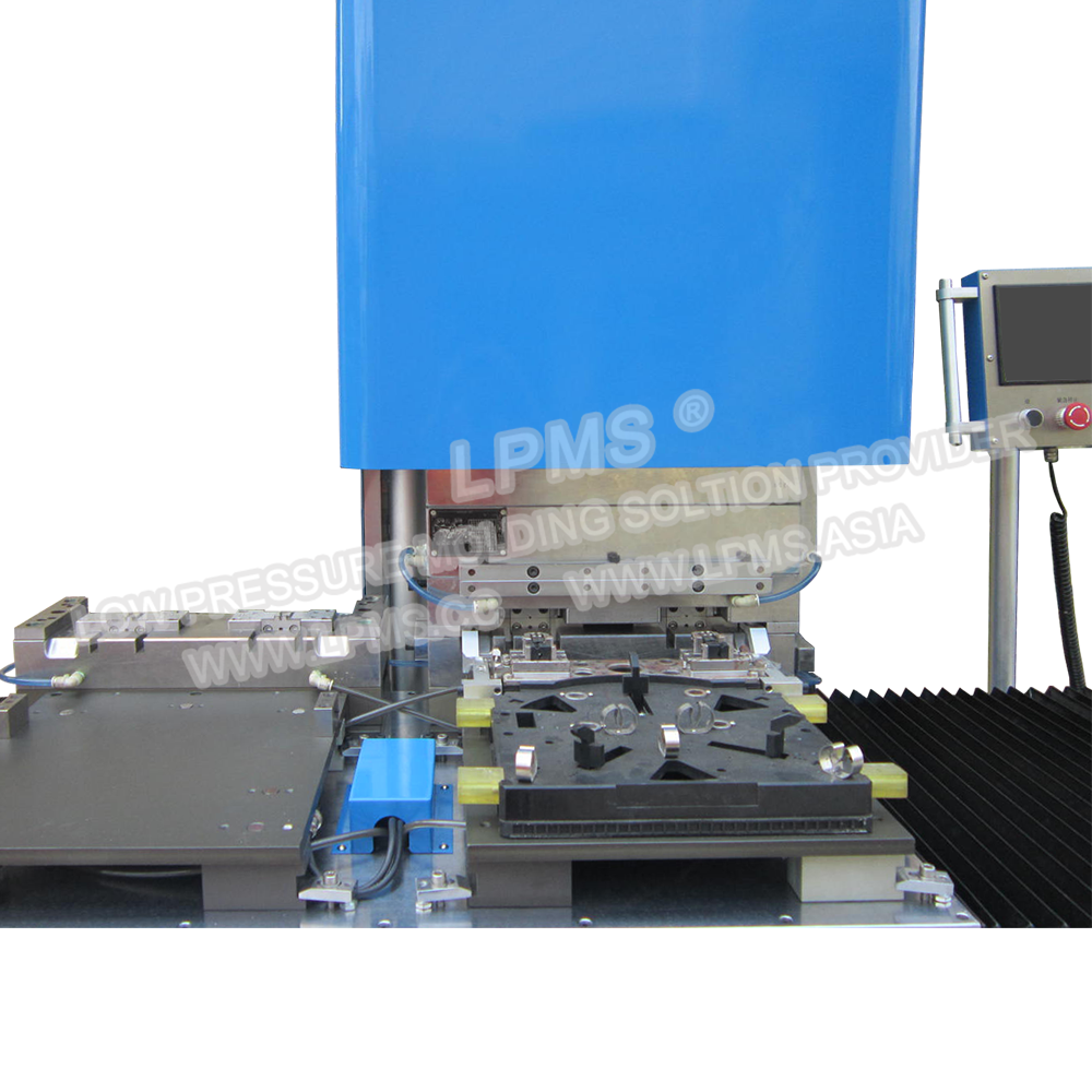 左右移模式工作臺, 一個(gè)上模對兩個(gè)下模,同時(shí)和客戶的生產(chǎn)線配合,生產(chǎn)過程實(shí)現(xiàn)自動化。