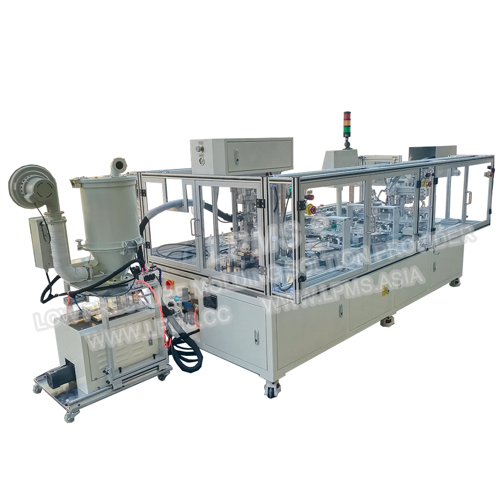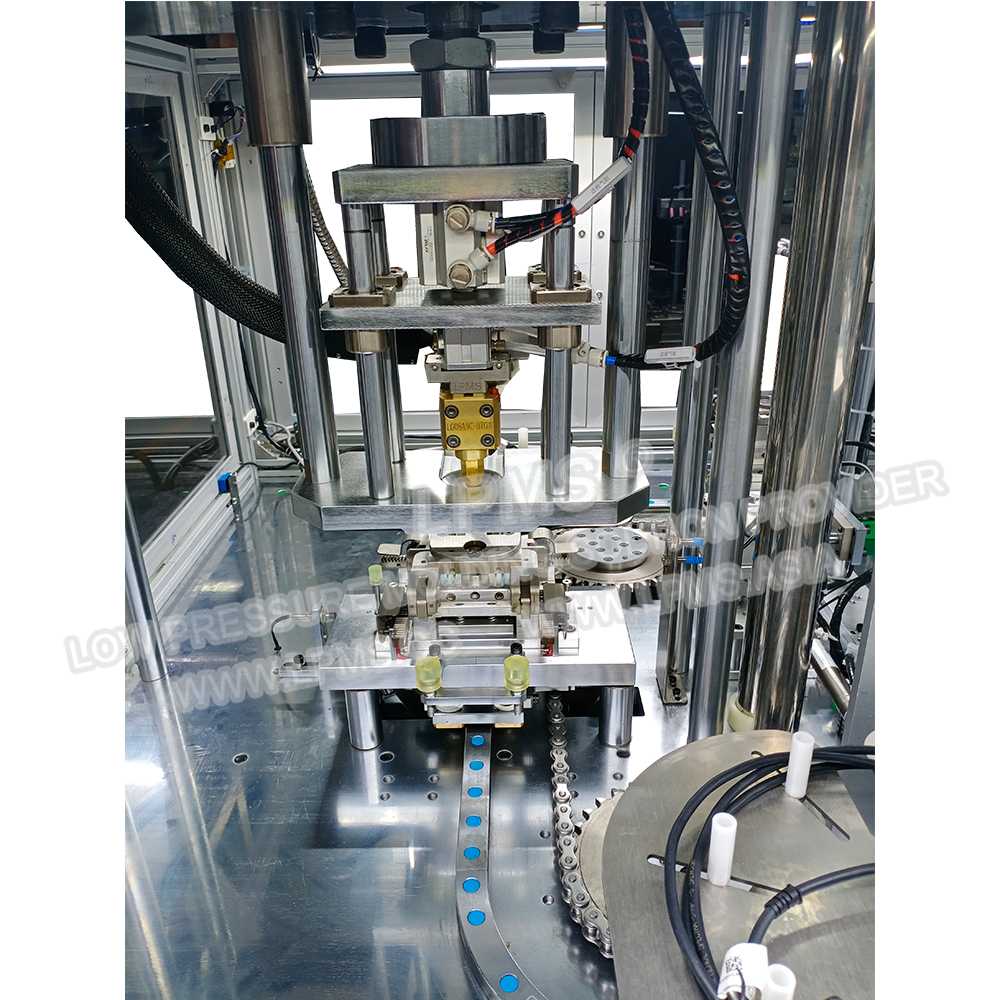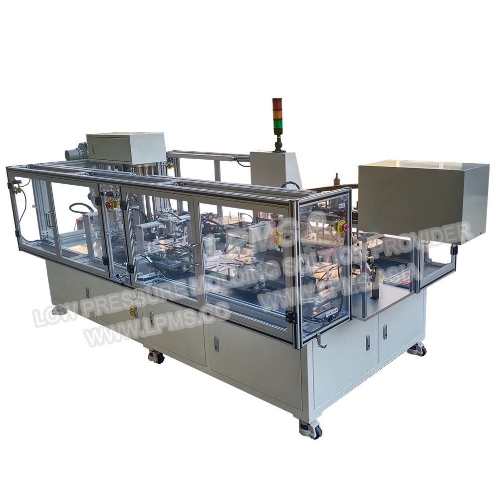 環形軌道式自動低壓注塑機環形軌道上均布8個工位(工位數量可根據產品工序增加或減少),2個工位放線擺線其他工位自動工作(CCD檢測、合上模,低壓注膠,開線夾,開上模,頂出取水口,取成品).